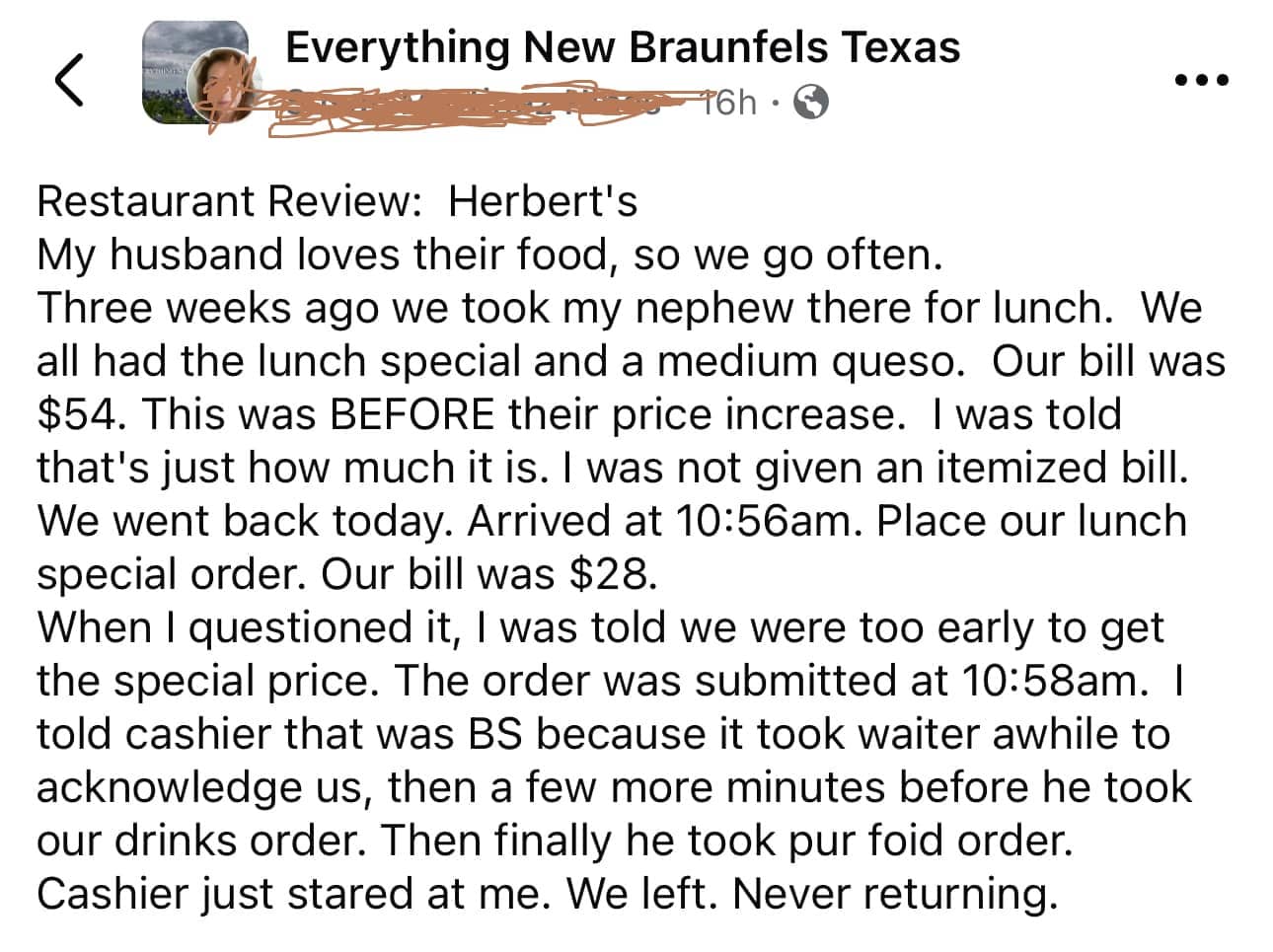 After a costumer left a scathing review of Herbert’s in New Braunfels the restaurant clapped back – and they’ve got the receipts. “Sue” went on a local Facebook group and trashed the place after her bad experience at lunch. Unfortunately for her, Herbert’s has a manager that stands up for their employees and surveillance to back them up.