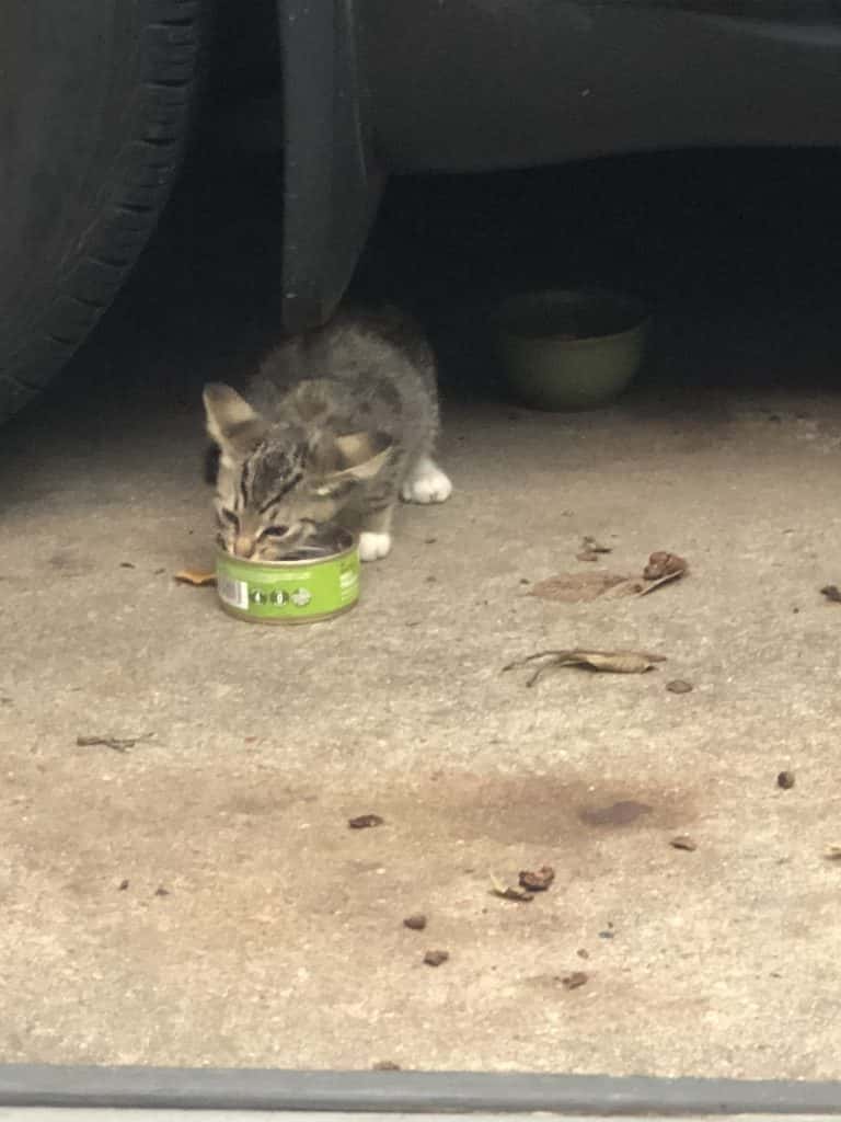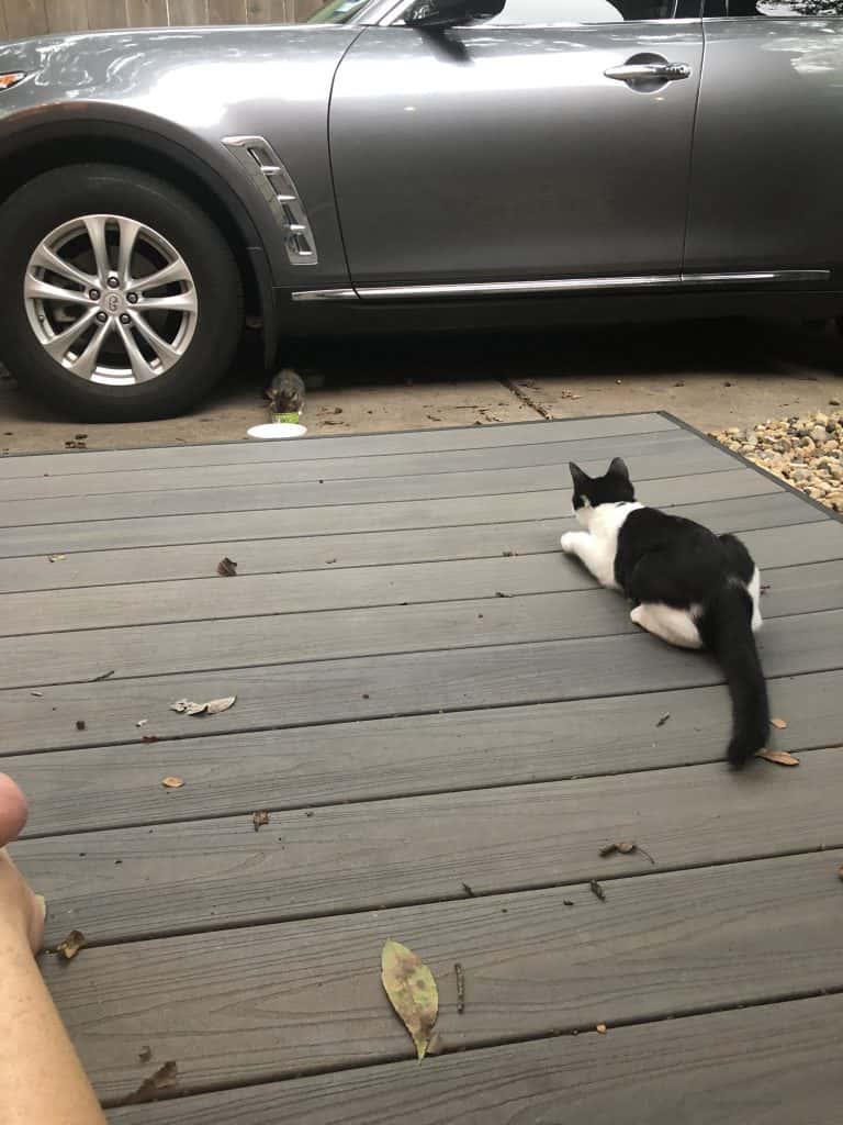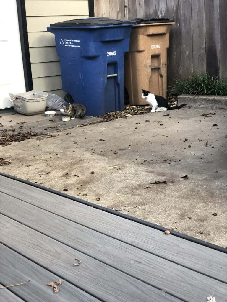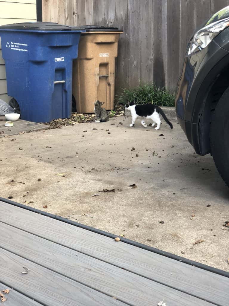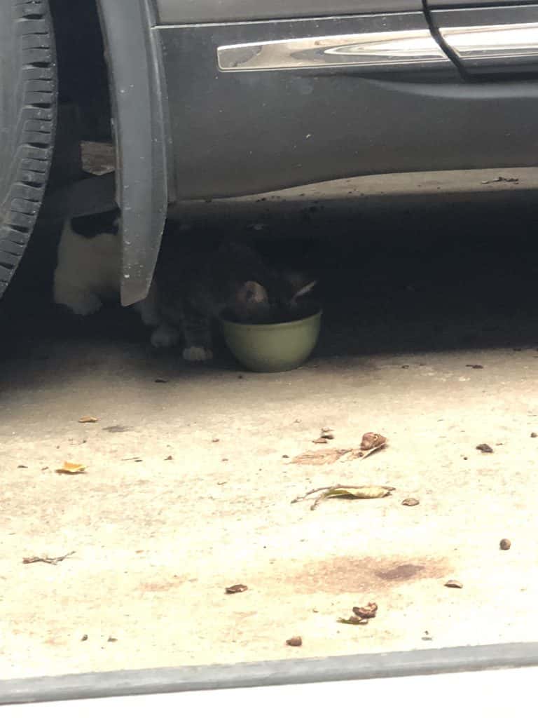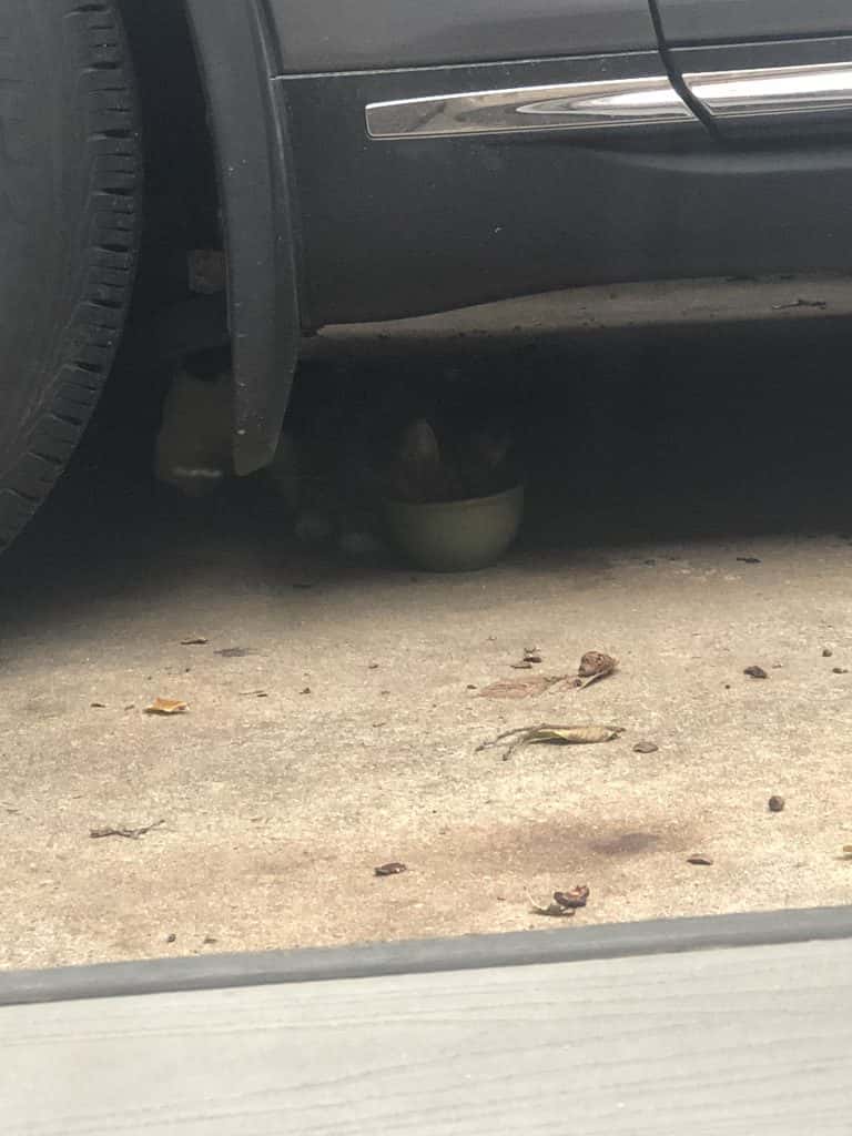 Deb's Cat George and a stray cat hide underneath Deb's car.