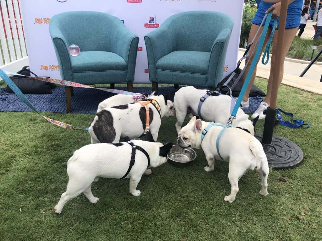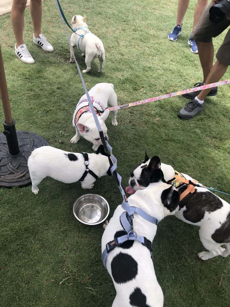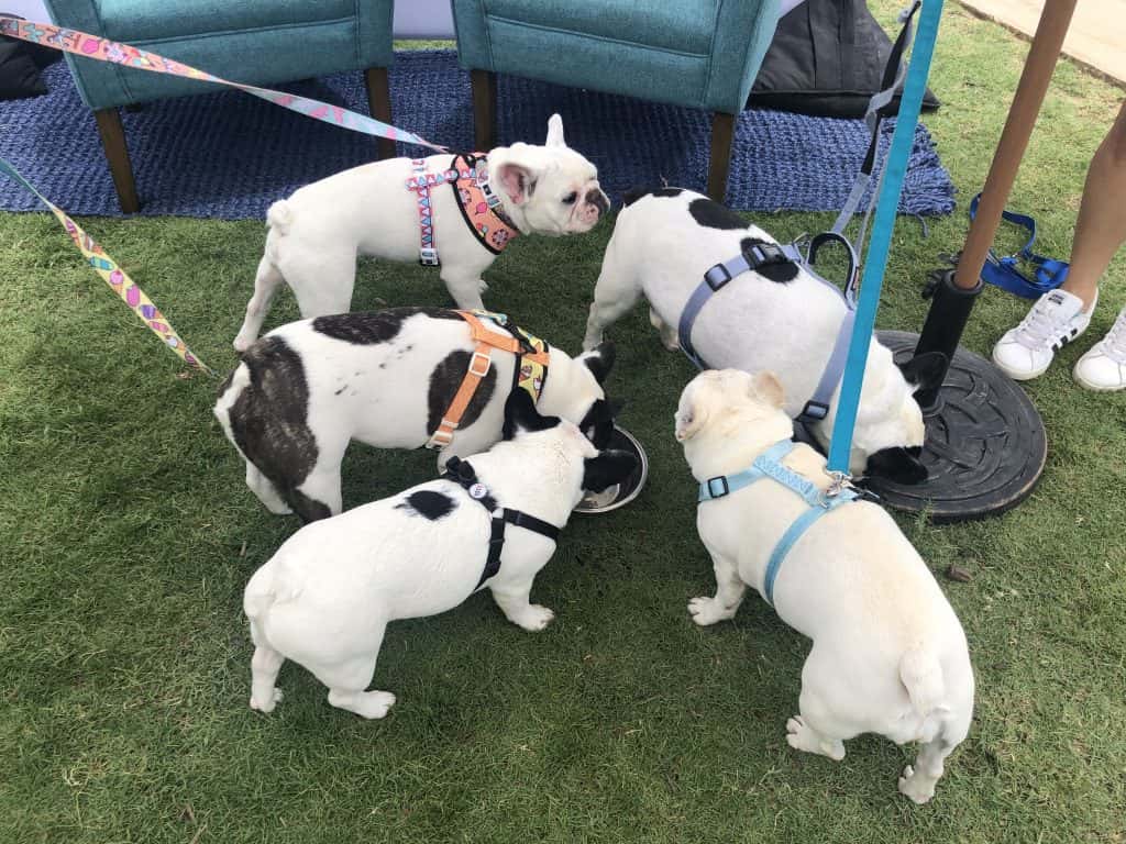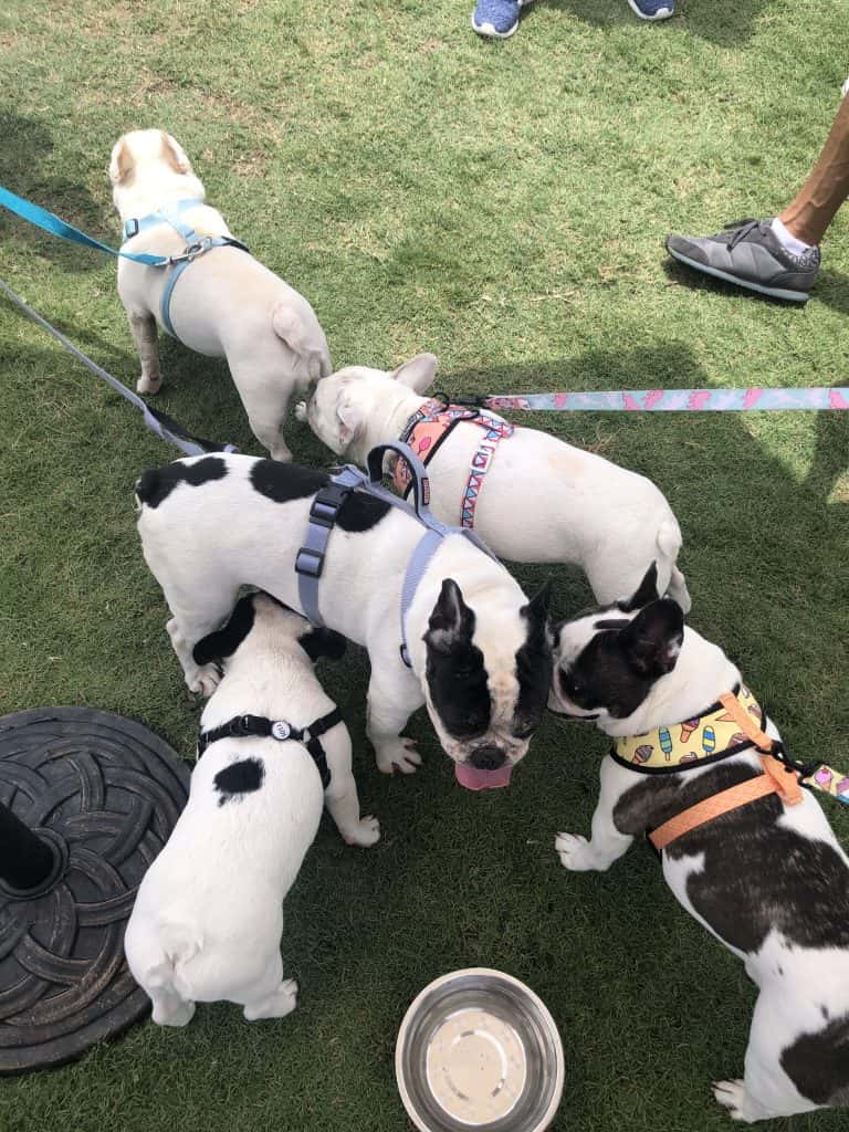 Five Frenchies playing at the Amazon Treasure Truck Pup Fest drinking water.