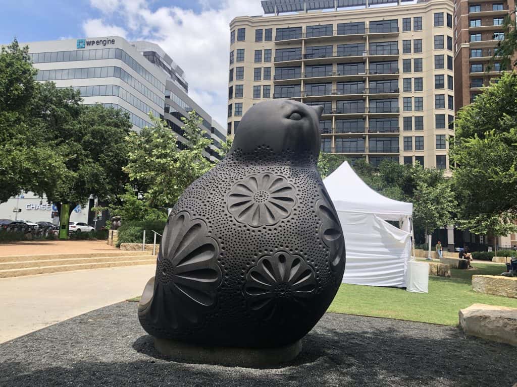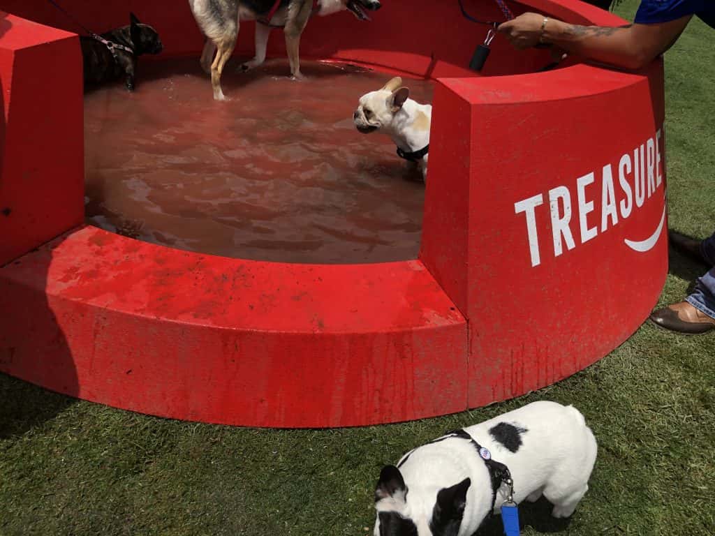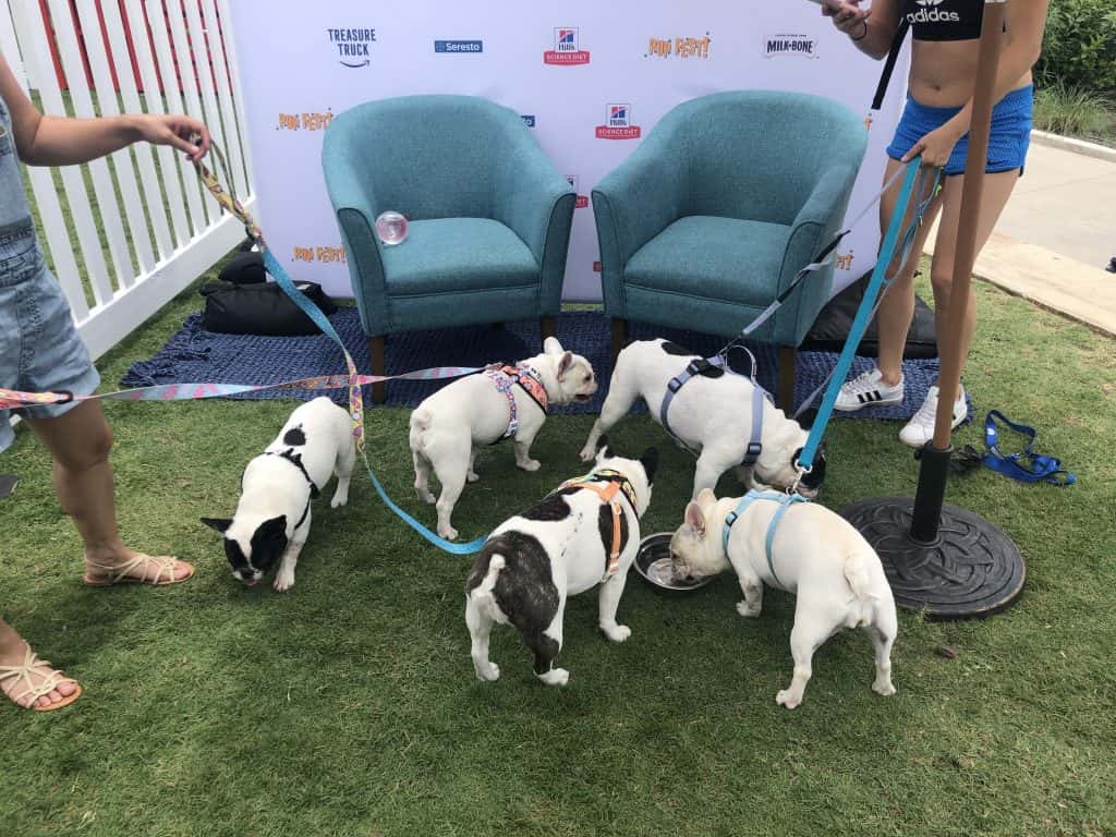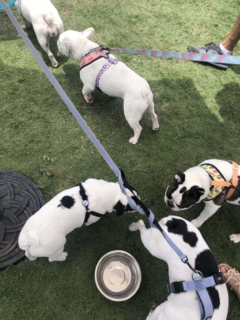 Five Frenchies playing at the Amazon Treasure Truck Pup Fest drinking water.