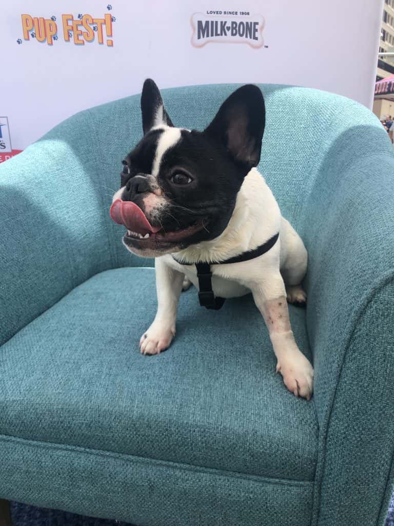 Alfie on a couch at the Amazon Treasure Truck Pup Fest.