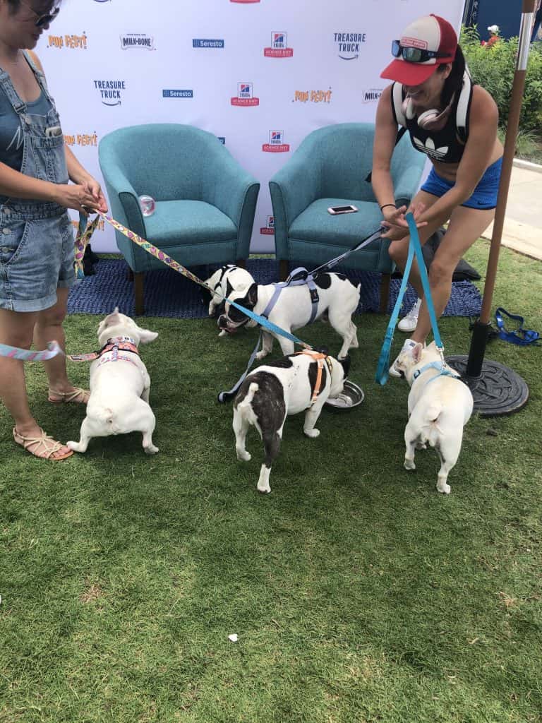 Five Frenchies playing at the Amazon Treasure Truck Pup Fest with their moms.