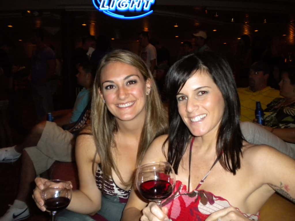 Deb and former ‘Sorority Intern’ Cassandra at the Bahamas Bud Light Party Cruise from 2009. Deb is holding a glass of wine and Cassandra is wearing a patch.