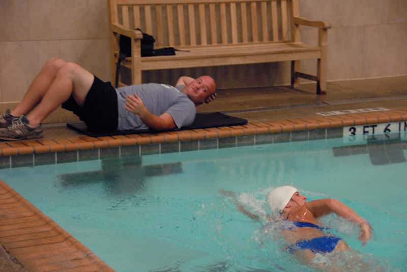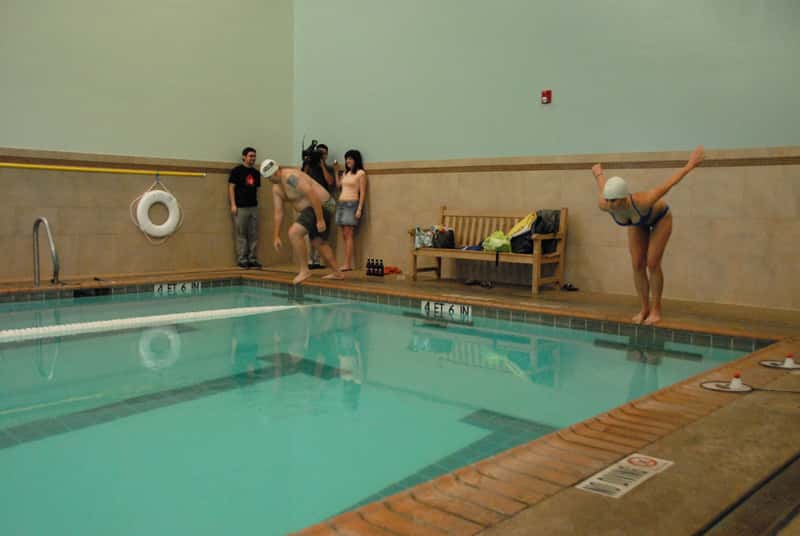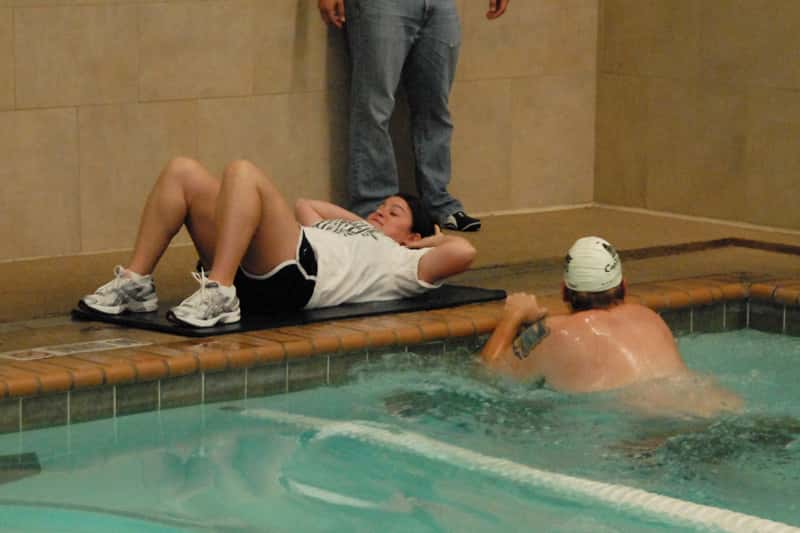 Deb in the water as her partner does situps at the Jason And Deb’s Modern Decathlon in 2008.