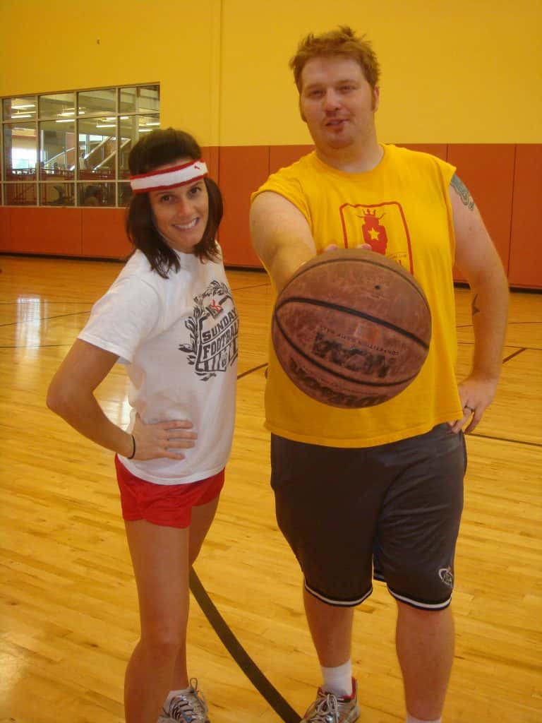 Jason and Deb holding a basketball at the Jason And Deb’s Modern Decathlon in 2008.