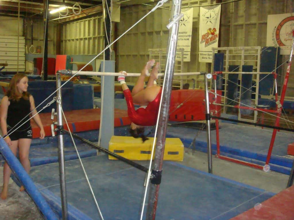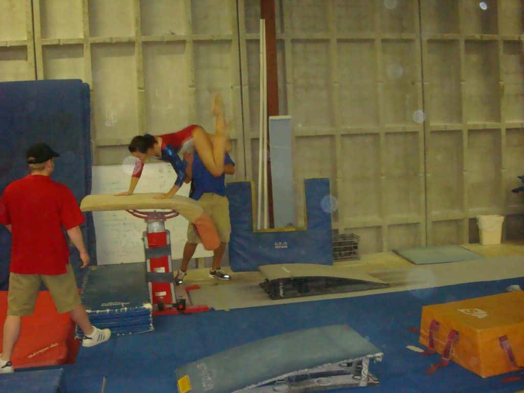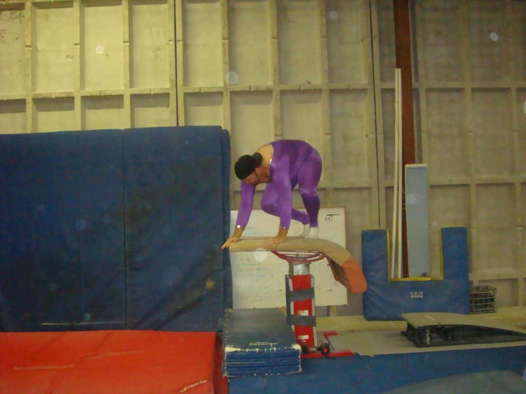 Deb flipping on a balance beam at the Jason And Deb’s Modern Decathlon in 2008.
