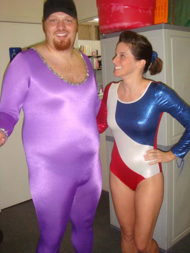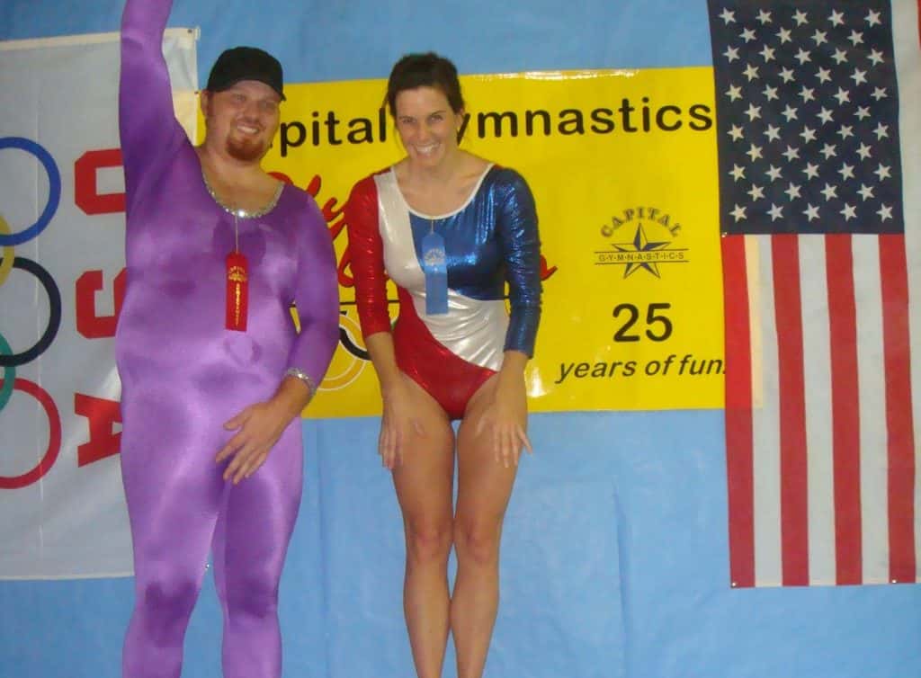 Deb and Jason in leotards doing a power pose at the Jason And Deb’s Modern Decathlon in 2008.